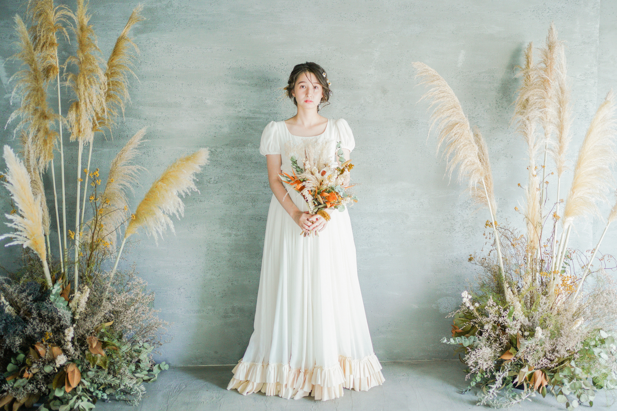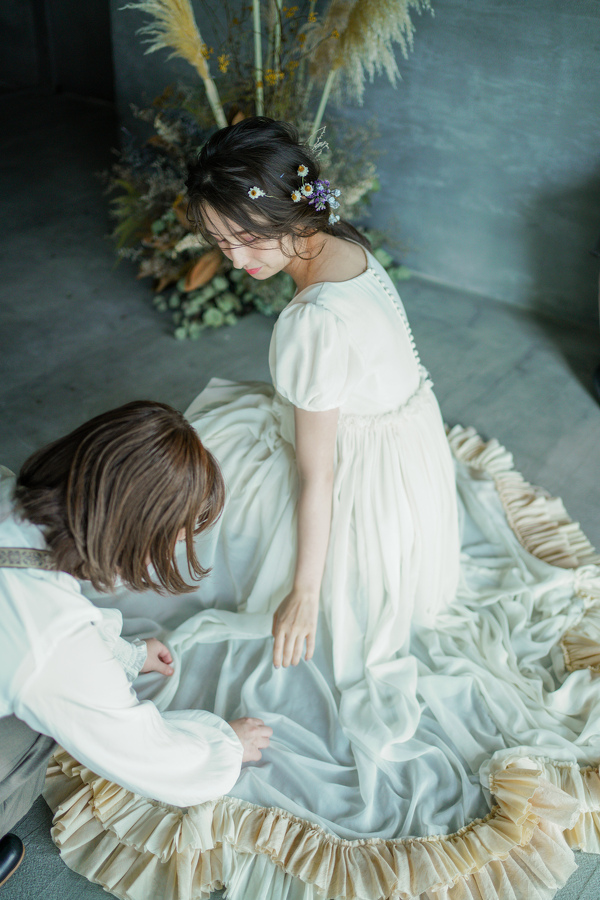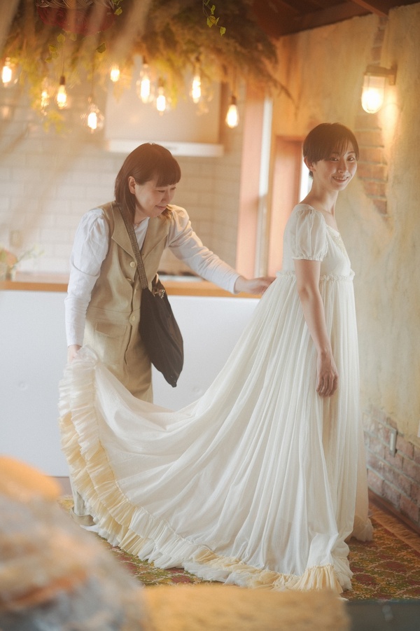 これまでデザイナーとして奮闘してきた久保田さんには現在の事業へと繋がる大きな出会いがあった。「当初はレディースのファッションラインでアクセサリーやバッグ、一点物の洋服を作っていて、その時にインスタレーション※用に飾るドレスを作ったのが初めて作ったドレスでした。ある日、そのドレスを見た方が『私、結婚式でこのドレスを着たいです』と仰ってくださって本当に驚きました。そのあとも新郎新婦さまのご厚意で式当日のフィッティングに入らせていただき、お支度が終わった後にパーティーにも参加させていただくことができました。初めて作ったドレスを花嫁さまに着ていただけて、皆さんに祝福されている姿を見ることができたことが1番印象的な仕事であり、今の私が形成されるきっかけとなったとても重要な出会いでした」。