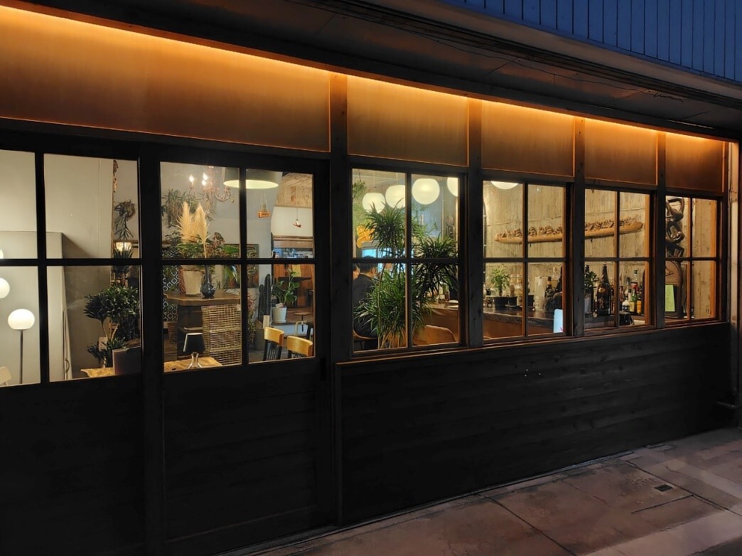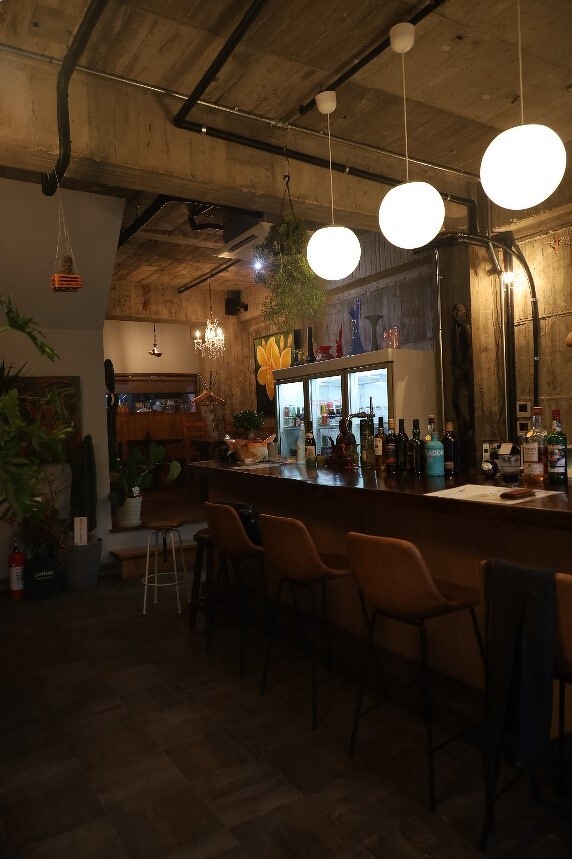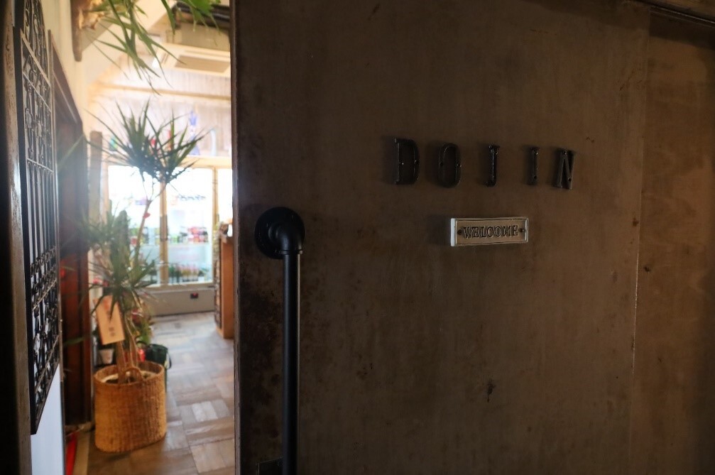 外からもよく見えるお洒落な雰囲気の店内は、アジアやアフリカの民芸品や植物で装飾された居心地のよい空間。これまでの“どじん”のテイストを引き継ぎながらも、女性客や子連れの方でも入れるようにバランスをとった、ほっと一息付ける空間になっています。店に入るには、向かって左端の金属製の扉を開け、少し進んでまた金属製の引き戸を開ける必要があります。このちょっとした手間も、入店の儀式のようで、ワクワク感を高めてくれます。