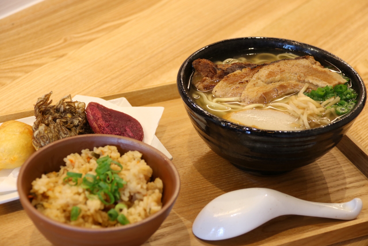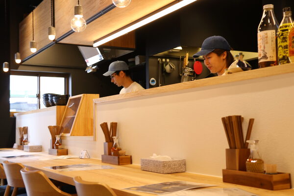 若い方や女性にも沖縄そばを食べに来てほしいと、内装はモダンでおしゃれな雰囲気が漂う。しかし外観や天井に旧店舗の名残が見られるのは、地域に愛された旧店舗のお客さんが訪れた際、思い出話に花を咲かせてもらいたいとの思いから。牧夫妻の人柄の良さもこの店の魅力の一つだ。