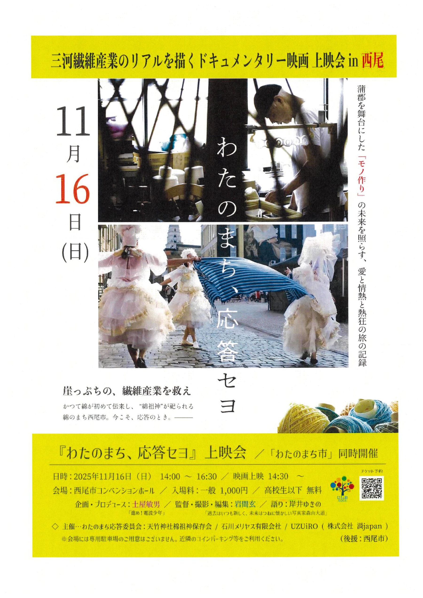 プロジェクトを進めるなかで、もう1つの挑戦が生まれました。映画『わたのまち、応答セヨ』を観たことをきっかけに、西尾が“綿のまち”である原点をあらためて確認。「この文化を未来に手渡したい。」と、上映会企画が始動します。市内に映画館がないなか、仲間や天竹神社棉祖神保存会と手を取り合い開催へ。“棉祖神”を祀る神社の歴史と自社の原点がつながり、地域文化を守り育てる視点がより強く育っていきました。