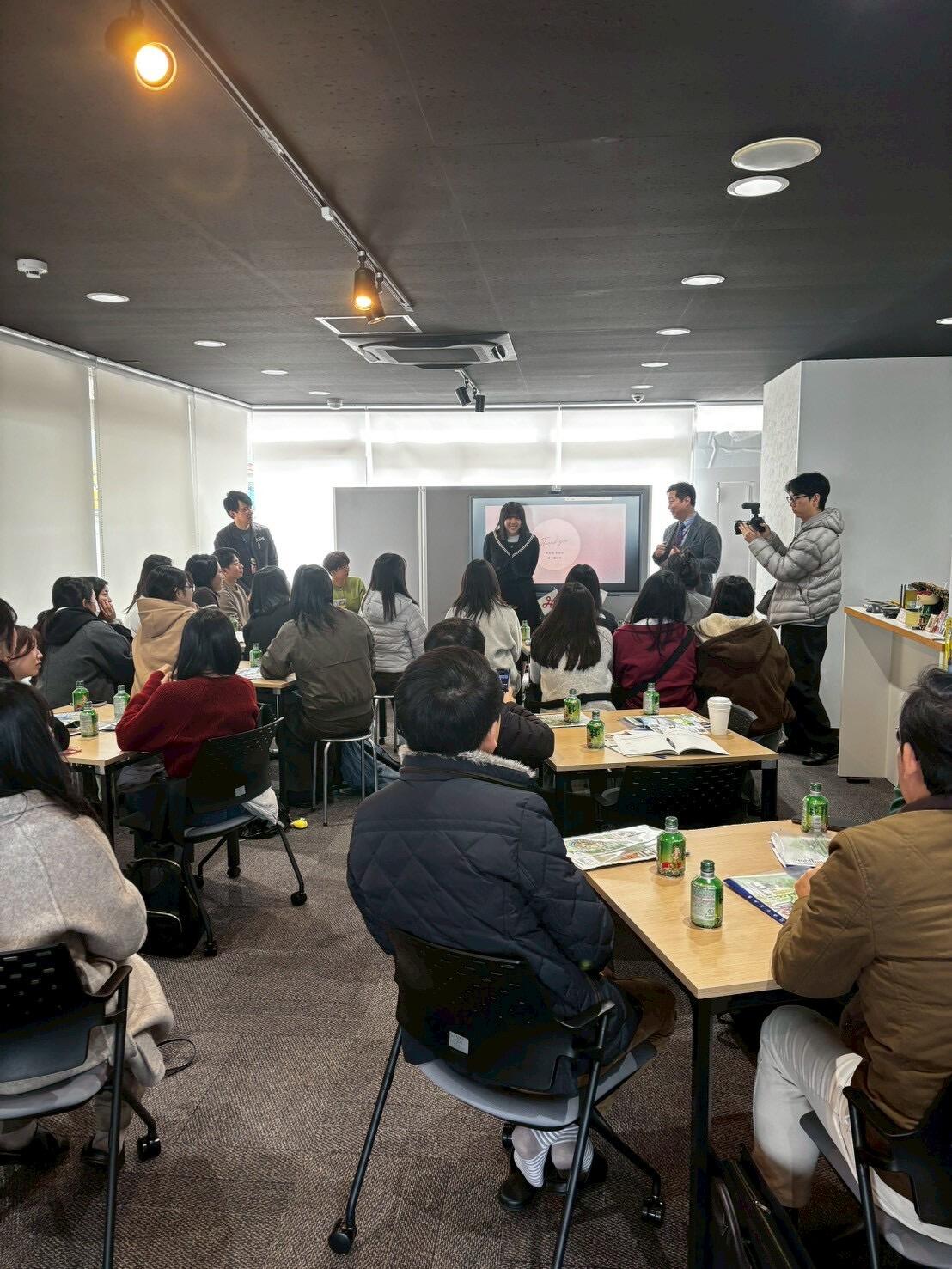 また、交流の一環として、韓国文化に関心のある市内の中学生が参加し、自己紹介をおこないました。流暢な韓国語での挨拶に視察団からは驚きの声が上がり、会場は一気に和やかな雰囲気に包まれました。その後は、音楽など若い世代ならではの共通の話題で会話が弾み、世代や国境を越えた交流の場となりました。